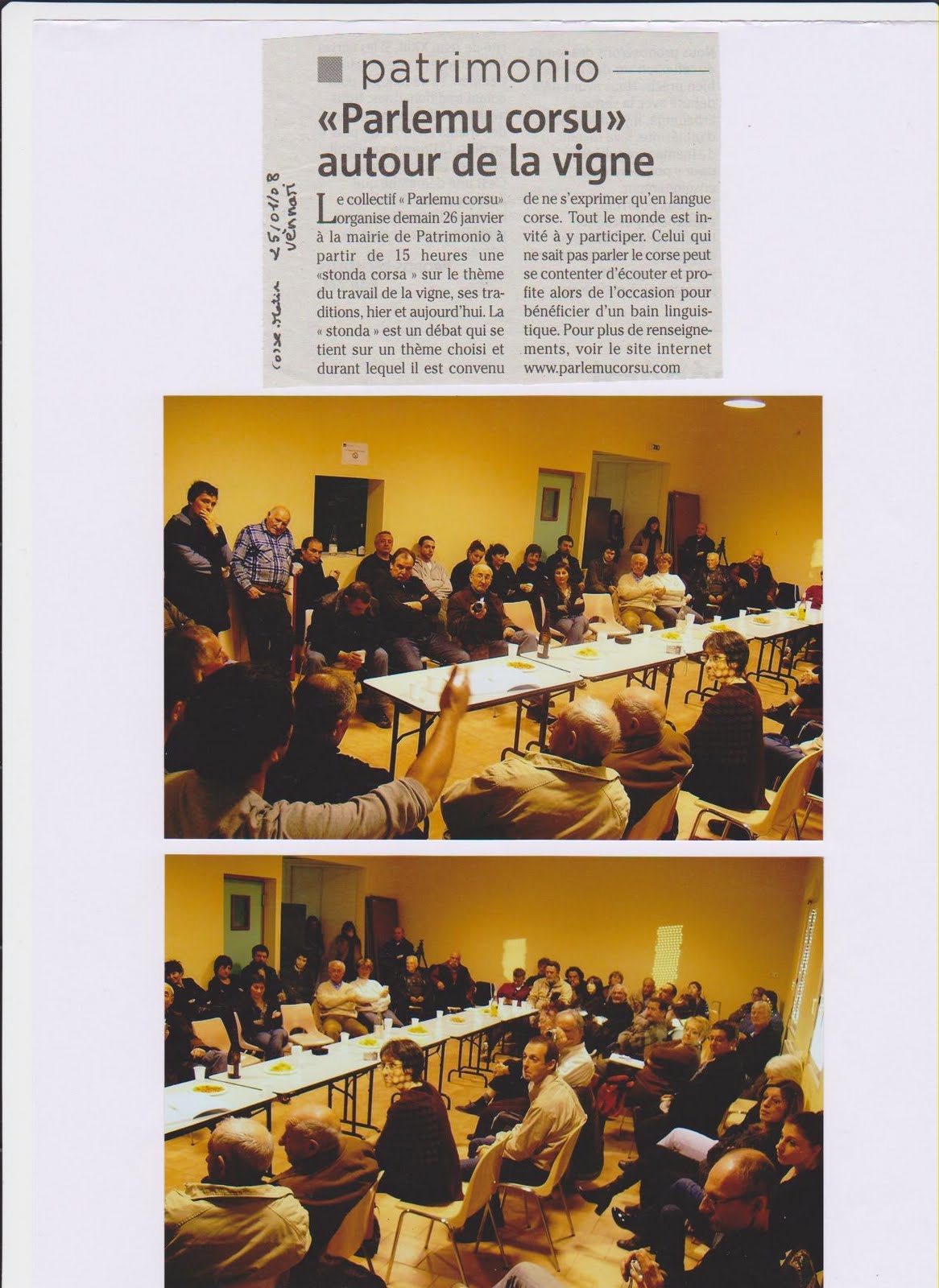 In a sala di a mirìa di Patrimoniu s’èrani aduniti guasgi 80 parsoni : i vinaghjoli di u circondu, in attività o à a ritirata, tutti cuntenti d’essa vinuti par isprìmasi à nantu à u so mistieru è dinò l’abitanti di u locu è ancu d’al di là (di Bastia, di a Castagniccia, di u Niolu, di Portivechju…).