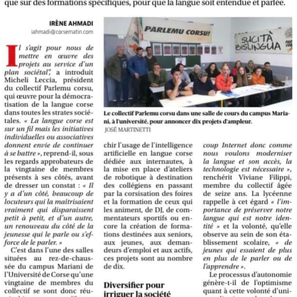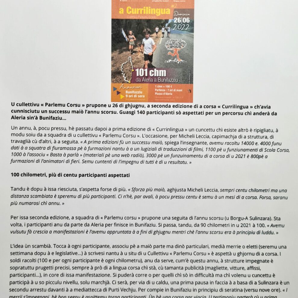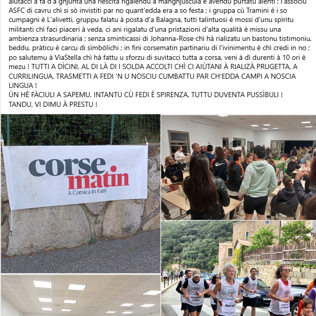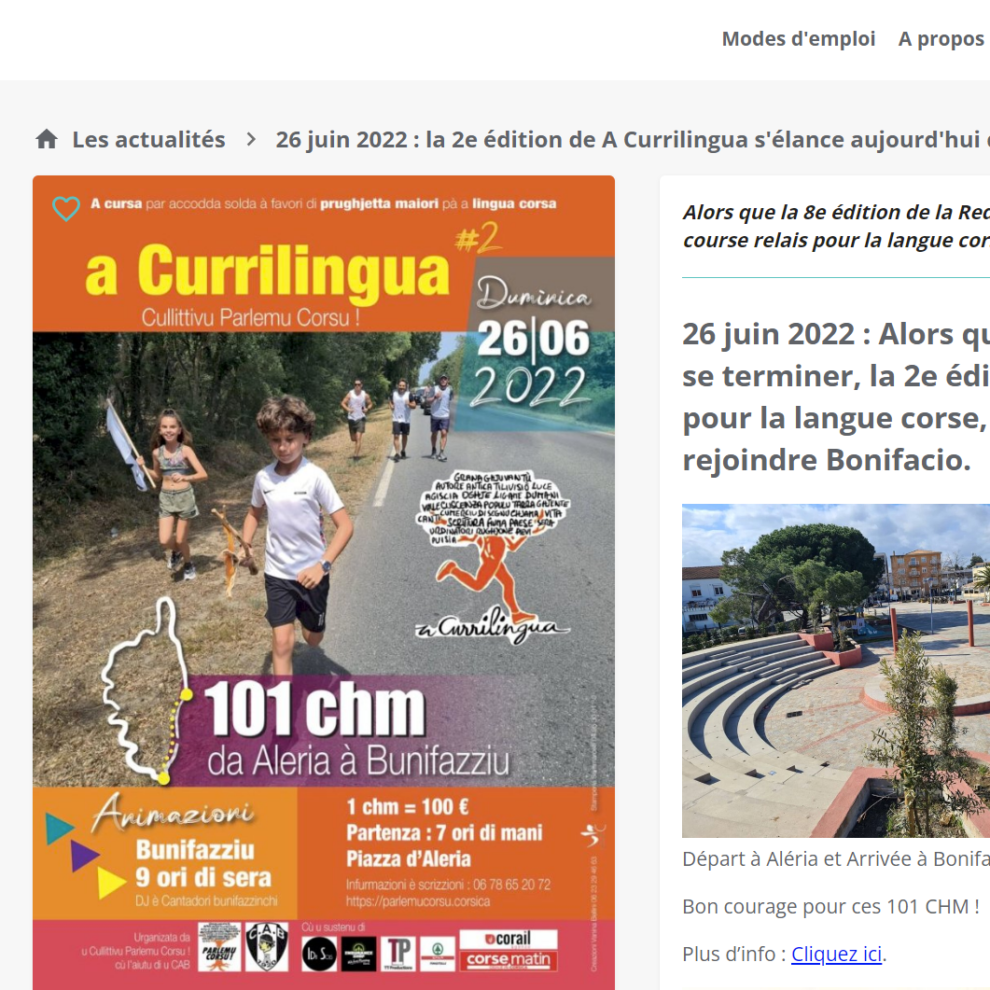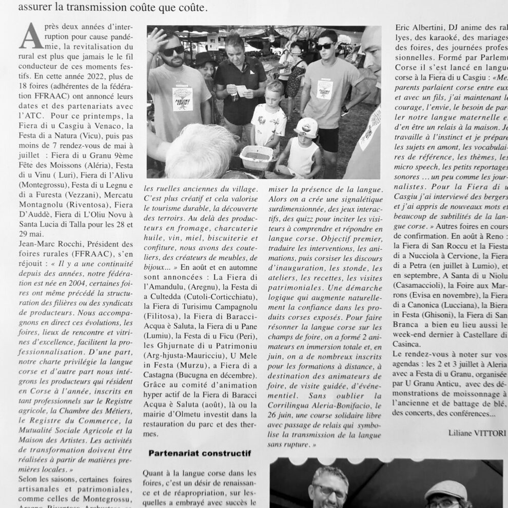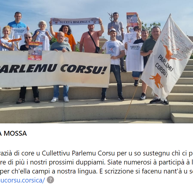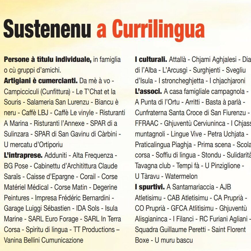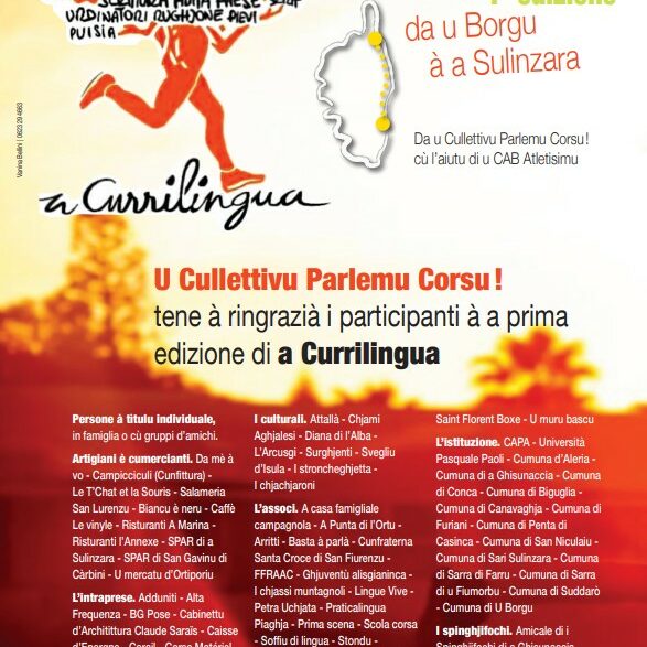 • Tutte l’azzione cuncrete, fatte per mustrà l’esempiu è à traversu tanti è tanti paesi di Corsica, da u Capicorsu à Bunifaziu, da Livante à Punente. Azzione chjamate “stonda corsa”,  “ghjurnate à tema”, “animazione per i chjuchi”, “dibattiti cù traduttori” è “fà aduprà u corsu à l’altri (per e fiere, i festivali o l’evenimenti spurtivi)”… trattendu di tanti è tanti sugetti, pè parlà di patrimoniu o di novi tecnolugie, di i tradizione o di u futuru…