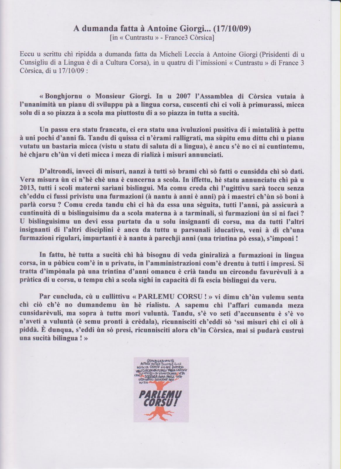'Ssa dumanda (arrigistrata) hè stata fatta da Micheli Leccia à Antoine Giorgi (Prisidenti di u Cunsigliu di a Lingua è di a Cultura Corsa).